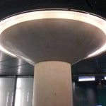In der Verteilerebene wird mit Betonpilzstützen gearbeitet, die oben von einem Lichtring umschlossen sind. Eine schöne Idee, das notwendige mit etwas praktisch schönem zu verbinden. Durch die Pilzform hat man auch nicht direkt den Eindruck, dass man einfach mal eben einen Stützpfeiler in die Halle setzen musste, sondern auch noch etwas für das Auge geschaffen.