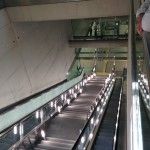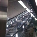 Beim Abgang der Haltestelle fällt vor allem die lange Treppe auf, die einen von der Verteilerebene runter zum Bahnsteig bringt. Diese hat zwischen den Rolltreppen im Geländer nochmal eine extra Beleuchtung. Außerdem sind in den Betonwänden im Abgang kleine LEDs eingelassen, die zusätzlich nochmal etwas Licht schaffen.